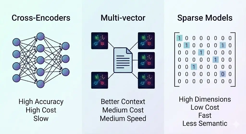 Yani LIMIT dataseti, embedding modelleri için bir kabus olsa da, cross-encoder için “çocuk oyuncağı”. Ama maliyet ve hız yüzünden tüm Google aramalarında en başta kullanılamaz.
