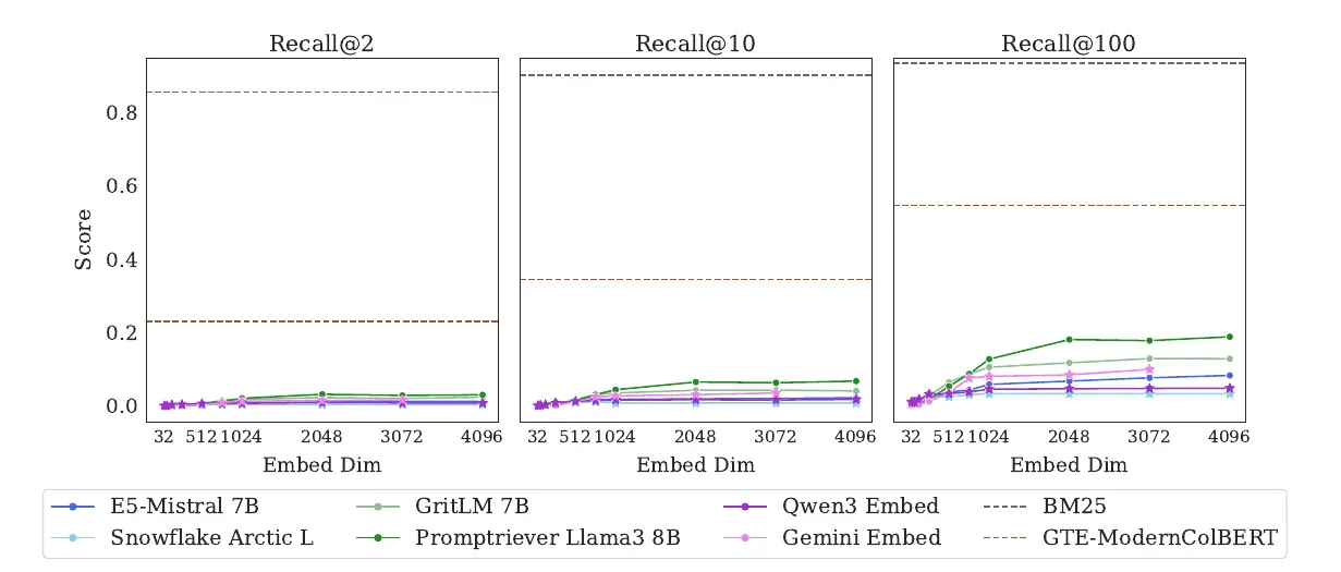 LIMIT dataseti de tam olarak bu soruna odaklanıyor. Belirli bir $n$ boyutu için (örneğin 768 boyutlu bir vektör), %100 doğruluk ile temsil edilebilecek (yani hatasız sıralanabilecek) doküman sayısı kaçtır?
