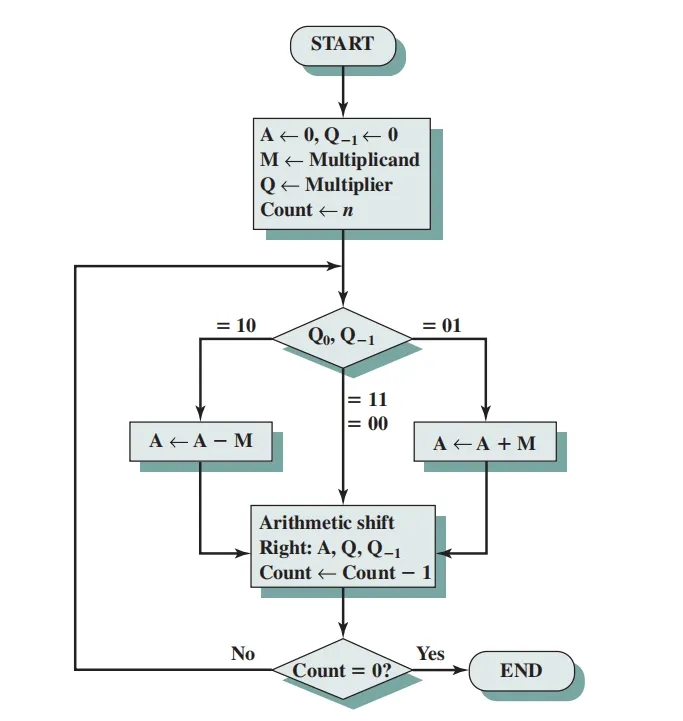 Not: İşaretli sayılar için çarpma işlemi booth algoritması ile olur. Onun sözde kod halini vermeyeceğim ama akış şemasını ekleyeceğim.