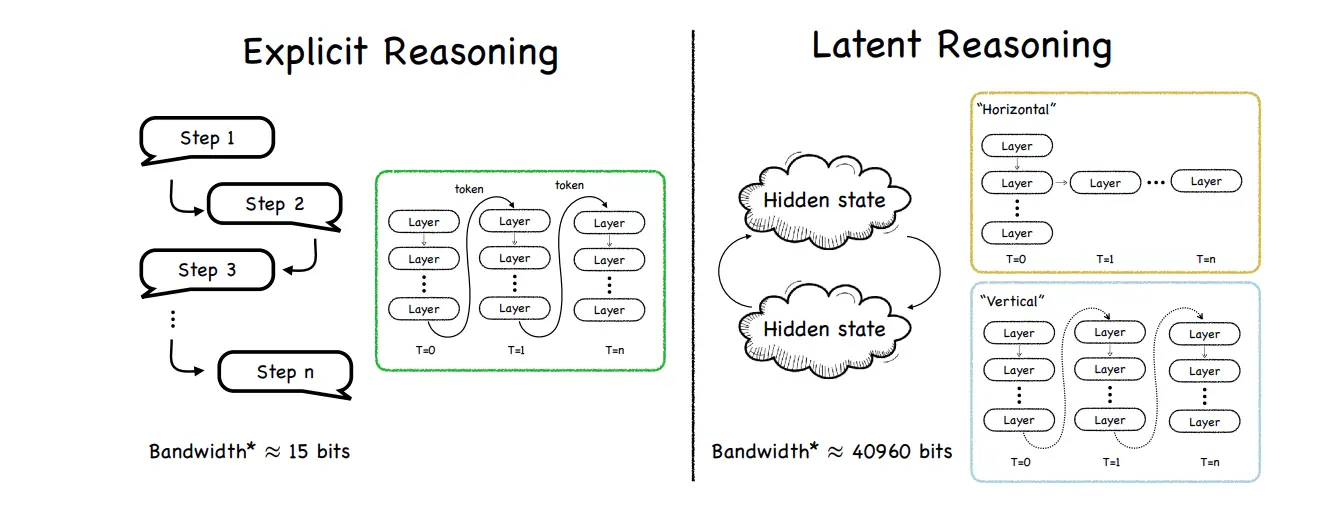 Explicit Reasoning, bugün GPT’lerde gördüğümüz klasik Chain of Thought yaklaşımı iken, Latent Reasoning ise modelin aklından geçenler kelimeye dökülmeden, kendi içinde gizli (latent) temsil olarak kalıyor. Nasıl çok çalıştığımız bir gün sonunda gece yatmadan önce aklımızdan aşırı hızlı bir şekilde anlamsız düşünceler geçiyorsa, latent reasoning de modelin aklından çok hızlı şekilde -ama bu sefer anlamlı (?)- düşünceler geçiyor. Öyle ki bu içsel bilgi taşıma kapasitesi (bant genişliği) makaleye göre 40960 bit’e kadar çıkmakta. Ama bu durumda açıklanabilirlikten ödün verip, verimliliğe pay veriyoruz. 8