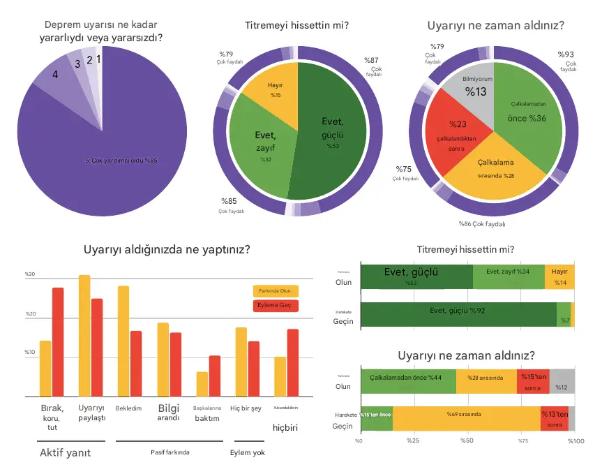 3 yıllık çalışma süresi boyunca, sistem Türkiye’de aylık ortalama 312 deprem tespit etti ve bunların büyüklükleri M 1,9 ile M 7,8 arasında değişiyordu. M ≥4,5 büyüklüğündeki depremler için 98 ülkede uyarılar gönderildi; bu, aylık yaklaşık 60 olay ve 18 milyon uyarıya karşılık geliyor. Kullanıcı geri, uyarı alan kişilerin %85’inin sarsıntıyı hissettiğini ve %36, %28 ve %23’ünün sırasıyla sarsıntıdan önce, sarsıntı sırasında ve sarsıntıdan sonra uyarı aldığını göstermektedir. Akıllı telefon tabanlı deprem algılama algoritmalarının nasıl büyük ölçekte uygulanabileceğini ve olay sonrası analizlerle nasıl iyileştirilebileceğini gösteriyoruz ~ Allen et al., Global earthquake detection and warning using Android phones 1