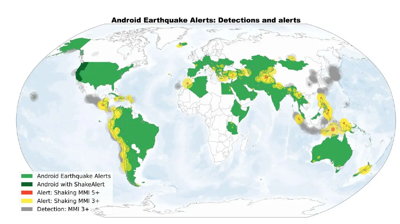AEA’nın yaygınlaştırılması, 11 Ağustos 2020’de Kaliforniya’da ShakeAlert tarafından üretilen uyarıların iletilmesiyle başladı. Android telefonlarının kendi tespitlerine dayalı uyarılar ise ilk olarak 28 Nisan 2021’de Yeni Zelanda ve Yunanistan’da devreye girdi, ardından 15 Haziran 2021’de Türkiye, Filipinler ve Orta Asya’ya genişletildi. 2022’de sistem, uyarıların verilmesine izin verilen diğer yüksek riskli ülkelere de yayıldı. 2022 sonunda 93 ülkede, 2023 sonunda ise 98 ülkede AEA uyarıları gönderiliyordu. ~ Makaleden