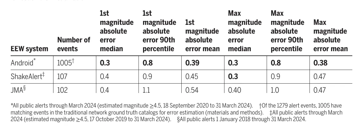 AEA, ABD ShakeAlert ve Japonya JMA ile karşılaştırılmış. Hata oranları benzer, ama AEA: