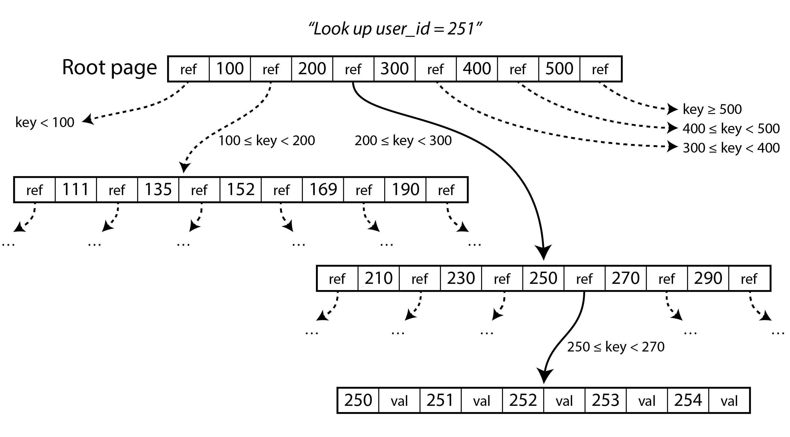 B-Tree’ler, klasik ikili arama araçlarından oldukça farklı bir yapıdadır. Daha önce gördüğümüz LSM ağaçları, veri tabanını değişken boyutlu segmentlere ayırır; bu segmentler genellikle birkaç Megabayt veya daha büyük boyutlardadır, bir kez yazılır ve daha sonra değiştirilemez. Buna karşılık, B-Tree’ler veri tabanını sabit boyutlu bloklara veya sayfalara ayırır ve bir sayfayı yerinde üzerine yazabilir. Bir sayfanın boyutu geleneksel olarak 4 KiB‘dir, ancak PostgreSQL artık 8 KiB ve MySQL varsayılan olarak 16 KiB kullanmaktadır.