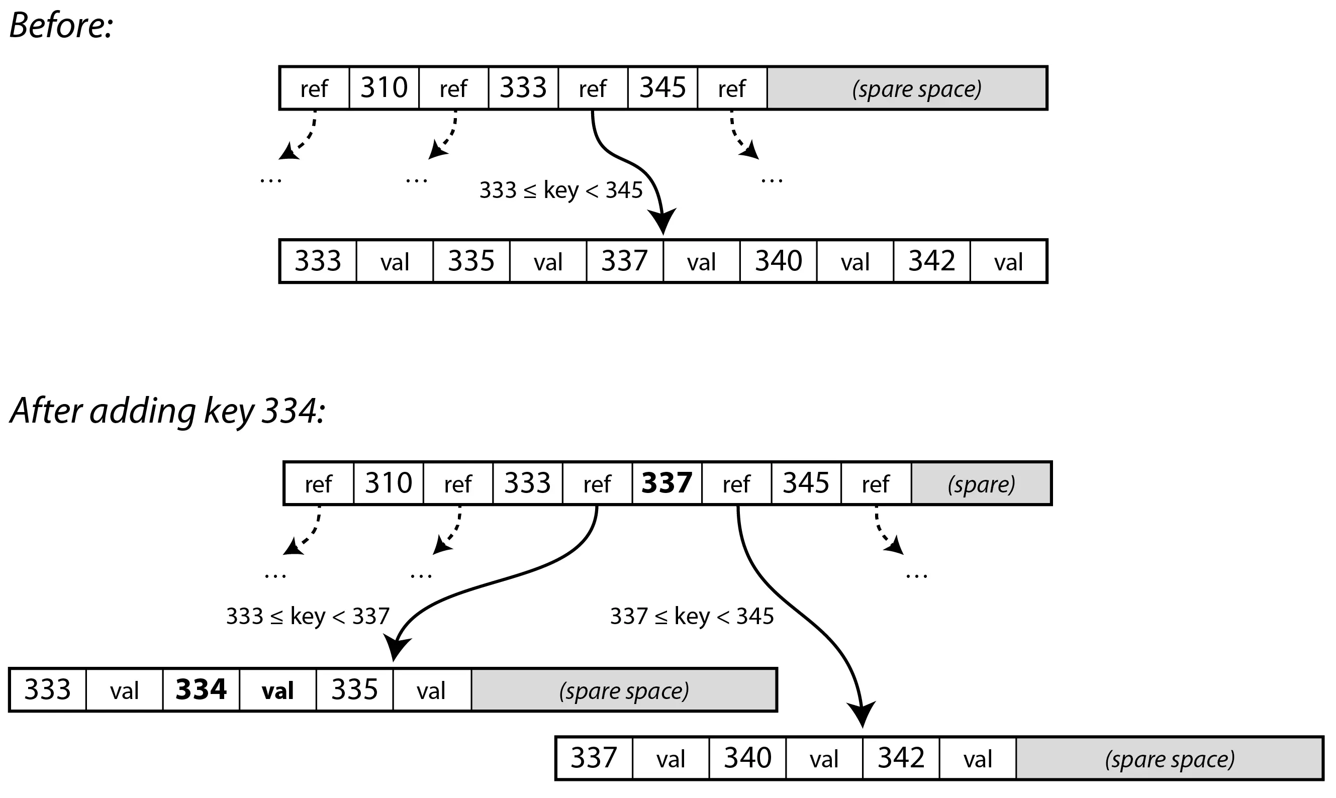 Diyelim ki 334 anahtarını eklemek istiyoruz ancak 333–345 aralığını tutan sayfamızda artık tek bir bitlik bile yer kalmamış. Sistem bu durumda şu adımları izler: